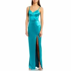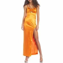 Deals 👍 City Vibe Spaghetti Strap Cinched Y-Neck Cutout Detail Slim Slit Hem Long 👗 Dress Orange 😍
