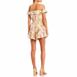 Cheap 🌟 City Vibe Off-The-Shoulder Tropic Floral Printed Tie-Waist Ruffle Romper Cream/lilac/moss 💯