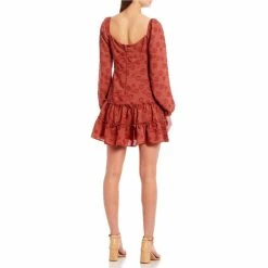 Buy 🥰 City Vibe Puffed Sleeve Floral Print Ruched Waist Fit-And-Flare 👗 Dress Rust/gold ✨