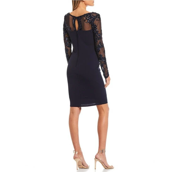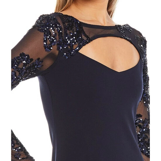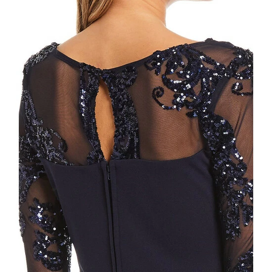 - Sequin-embroidered mesh fabric of polyester; Scuba crepe fabric of polyester/spandex
