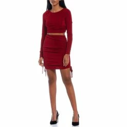 - matching slim-fit skirt with ruched detail and side ties at the hem